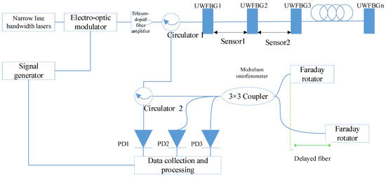 The advantage of DAS systems is that they can perform full-time and full-domain monitoring. The DAS system used in this study to detect the vibration signals of trains is shown in Figure 1. The continuous light emitted by the narrow linewidth laser is modulated into an optical pulse signal of fixed pulse width by an electro-optical modulator. The optical pulse signal is then amplified by an erbium-doped fibre amplifier and transmitted through a circulator to a UWFBG (ultra-weak fibre Bragg grating) array located in the monitored structure. As the fibre monitors the strain change caused by vibration, the grating in the fibre grating array returns a pulsed light signal at different times. Each grating vibration sensor has a reflection spectrum that enters the demodulator. The interferometer calculates the wavelength parameters of the measurement area by demodulating the reflection spectrum between two adjacent UWFBGs and outputs the interference result to three photodetectors. In this way, the vibration signal of a rail transit train can be obtained after photoelectric conversion. The length of the delay fibre in the Michelson interferometer is the same as the interval between adjacent UWFBGs in the optical cable. The distance between adjacent grating vibration sensors is 5 m. Each pair of sensors and the optical fibres between them form a measurement area.