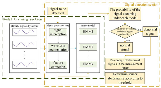 Driving vibration signals are time-series data. Methods for detecting anomalies in time series are mainly classified in three categories: clustering-based methods [7,8,9,10], deep learning-based methods [11,12,13], and statistical-analysis-based methods [14,15]. For driving vibration signals, there are structural differences in anomaly-containing measurement areas, resulting in large differences compared with normal measurement areas. Therefore, cluster analysis is prone to misjudgement under unsupervised conditions, making this method not suitable for driving vibration signal anomaly detection. Methods based on deep learning have high detection accuracy, but their computational complexity is high, and they cannot meet the real demand of detecting a large amount of data every day. As a dynamic statistical analysis model, the HMM can make full use of the contextual relationships of signals, has strong recognition ability for temporal signals, and displays good accuracy in detection results; thus, it has become a mainstream technology in speech recognition and other fields [16]. In recent years, the HMM has also been applied to the field of time-series anomaly detection [17,18,19,20]. As a machine learning method, it has higher detection accuracy and lower computational complexity than deep learning models.