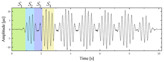 Although the lengths of driving vibration signals are different, the same physical process occurs when the train passes a sensor; therefore, these signals behave similarly in waveform and can be seen as different degrees of stretching in the time dimension. Based on this, we established a waveform segmentation method based on average amplitude according to the characteristics of the driving vibration signals, as shown in Figure 6. The idea is to find the waveform in S3. The amplitude of this part of the signal is relatively small, and the interval between adjacent waveforms is long, making it easy to distinguish. Except for S1, all transitions between different states must pass through S3, so finding all S3 allows for the separation of all the waveforms.