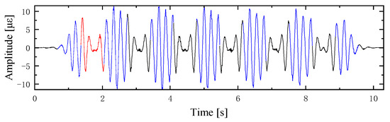 The average amplitude of each frame of the signal is calculated, and the short-term signal average amplitude (SAA) sequence is generated. The long-term signals collected by the DAS system contain a large number of white noise signals when no trains are passing; as these signals are meaningless in detecting track bed defects, we need to remove them to improve the quality of the data set. To do so, it is common practice to discard the first and last six frames. As the amplitude of white noise signals is often less than 0.5, in our method, we divide the long-term signal into frames. Each frame is 1 s long and contains 1000 points of short-term signals. If the average amplitude of the signal in this frame is less than 0.5, it is discarded immediately; otherwise, it is regarded as the beginning of the driving vibration signal; on the other hand, it is regarded as the end of the signal if the average amplitude of the following frames is less than 0.5. It should be noted that when a driving vibration signal is intercepted, the frame length is set to 1000 sample points for high interception efficiency. As a result, there is still a small amount of white noise in the intercepted signal, i.e., state 1, which affects waveform segmentation. Therefore, we need to further remove this white noise. This part of white noise is usually about 0.05 of the total signal length, so it can be effectively separated by removing the first and last six frames of the signal, as mentioned above. Since the key is to find state 3, even if part of the waveform in state 2 is deleted by applying the above method, this does not affect waveform segmentation.