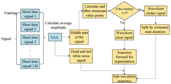 After removing the white noise, we search for the minimum points of the SAA sequence. These extreme points contain not only S3 but also some noise. Therefore, we need to filter these minimum points and retain the points that are 1.3 times greater than the minimum and less than 2 times greater than the minimum. Finally, the waveform state is determined based on the number of filtered extreme points. If the number of extreme points after filtering is the same as the actual number of S3, i.e., six (corresponding to the number of wagons), the signal is determined to be a clear waveform signal. Since the minimum value point corresponds to the mean time of S3, it is necessary to shift the sequence of minimum value points forward by approximately half the number of frames, typically three to five frames, to match the state start time, and then segment the signal. If the number of minimum value points after screening is not six, it means that the SAA sequence is unclear and that the signal waveform is poor; the signal is then identified as a chaotic waveform signal.