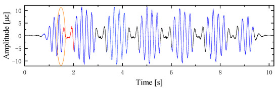 In the traditional framing method, first, a complex signal alignment algorithm is required to make the time series equal in length; then, the frame is divided by using a fixed sliding window. With this method, the transition between different states of the signal is not taken into account, which makes it suitable for processing high-frequency signals. The fundamental frequency of the driving vibration signal is low, and the state transitions are frequent. With the traditional framing method, there are a large number of transition frames between different states. The framing effect of the traditional method on the driving vibration signal is shown in Figure 5. For example, the red part of the signal in Figure 5 contains almost half of the S2 state and all of the S3 state. It is difficult for the model to accurately predict the state at this time.