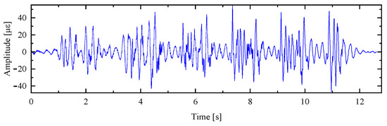 Track bed defects [24] mainly manifest in three aspects. Firstly, the original rigid structure of the track bed appears to have changed. When external forces are applied, the displacement in a defective track bed is larger than that in a normal track bed, the amplitude of the corresponding signal is larger, and the instantaneous impact is stronger [16]. Secondly, when the track bed structure is damaged, the interaction within the track bed is enhanced when a train passes, exacerbating damage to the track bed structure [17]. This interaction is different from the excitation of the track bed by a train and produces abnormal fluctuations that are not found in normal signals. In addition, due to the changes in the vibration transmission process caused by the damage to the internal structure, the signal waveform of a defective track bed is different from that of a normal signal, and there are certain differences in its model coefficients. A typical abnormal signal is shown in Figure 8. The above physical analysis of track bed defects is reflected in these signals. The peak value of the signal waveform exceeds 50, which is larger and has more ridges than the normal signal shown in Figure 4. The waveform of the normal signal is more regular.