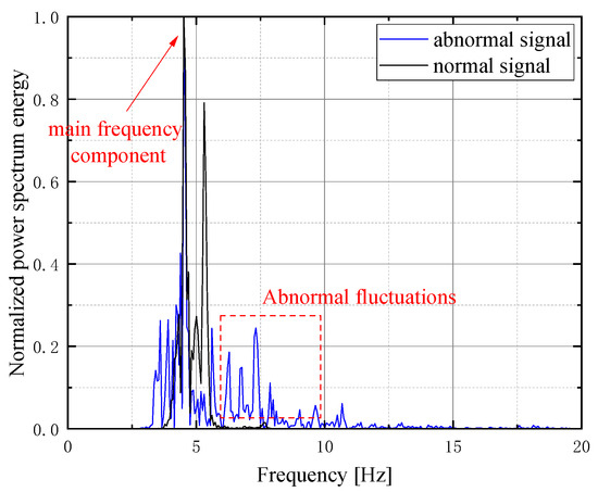 To accurately describe the difference in abnormal fluctuations, we propose a new feature quantity in the frequency domain: the adaptive power spectrum energy ratio. A driving signal has a main-frequency component that is related to speed and has high energy. However, a train accelerates and decelerates during its journey, so the main frequency fluctuates to some extent. A power spectrum energy comparison diagram of normal and abnormal signals is shown in Figure 9. The range of such fluctuations in the main frequency is small, generally within 2 Hz, but abnormal fluctuations are evident from 0 to 6 Hz above the main frequency. On the basis of the above differences, the adaptive power spectrum energy ratio feature quantity is proposed.