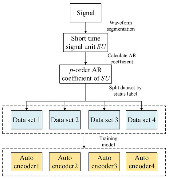 The AR model shows excellent performance on time series with relatively simple spectra and has lower computational complexity than the MA model. Moreover, there is no requirement for the length of the input data, which is suitable for the feature extraction of short-term signal units. To use the coefficients of the AR model as features, it is also necessary to determine the weight of each order coefficient. The autoencoder can solve the weight problem of the AR coefficient and can also mine the nonlinear information in the AR coefficient and reduce its dimension. Therefore, in this study, we innovatively used AR coefficients and autoencoders. The autoencoder model is trained according to the signal state. The analysis of the signal state is presented in Section 3. Figure 10 is a schematic diagram of the autoencoder training model.