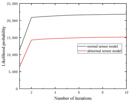 The HMM requires a number of iterations for training convergence. As shown in Figure 11, we plotted the iteration curves of the HMM in normal and abnormal measurement areas. As can be seen from the figure, all models could converge after two iterations, indicating that the training speed of the HMM is faster. The stopping condition we adopted was that the number of iterations reached 10 or the iteration error was less than 10−6. This stopping condition can effectively avoid the problems of overfitting and underfitting. When calculating the probability of the emission matrix using the HMM-GMM method, the probability of a single point cannot be calculated, so the probability density function values of the distribution are used instead [16], and these values are allowed to be greater than 1. To avoid data overflow, the logarithm of the probability is considered in the calculation.