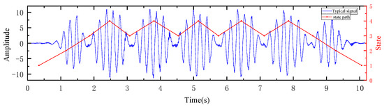 The track bed defect detection method proposed in this study has a high detection rate for signals in the defect detection area, and it also has accurate results when calculating the optimal hidden state sequence by using the Viterbi algorithm. The hidden state path diagram of a typical normal signal is shown in Figure 12. The experimental results show that the calculated optimal path is highly consistent with the state transition sequence observed in the actual physical process and that the state of each waveform can be accurately determined.