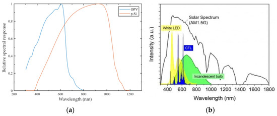Demonstrated (a) OPV and poly-Si relative spectral response [34] and (b) Spectrum of different light sources [35].