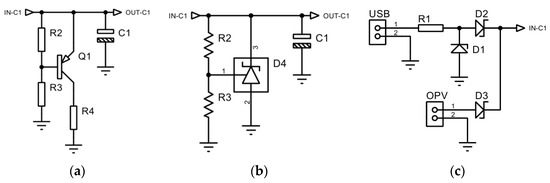 In addition to the voltage-limiting circuit on the capacitor, a Schottky diode was added for reverse current protection in the OPV, an auxiliary USB connection charging circuit with current and voltage limiting by Zener diode, protected against reverse current by a Schottky diode as shown in Figure 5c. Schottky diodes were chosen because of the low voltage drop in direct polarization.