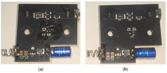 With the schematics defined, two PCB versions were made: Figure 7a shows the supercapacitor voltage control circuit carried out by the transistor and Figure 7b the circuit with the control carried out by the shunt regulator. Both versions have the same layout on the top side of the board. The choice of miniaturized components made it possible to develop the board in dimensions similar to those of a compartment for three AAA batteries.
