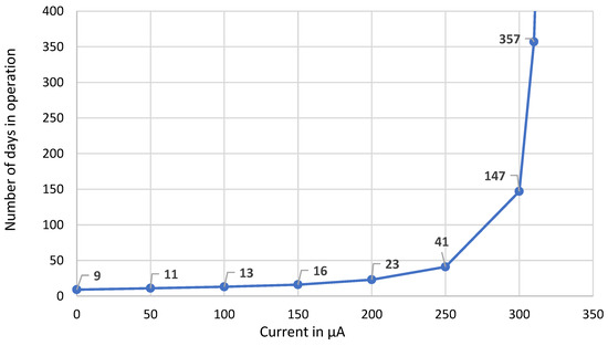After this test, situations with lower lighting values were simulated, in which the current supplied by the OPV was reduced by 50 µA per simulation, generating the graph shown in Figure 9, which represents the relationship between the current supplied by the OPV and the number of days that the system would continue to operate while maintaining the consumption pattern of the situation previously presented.