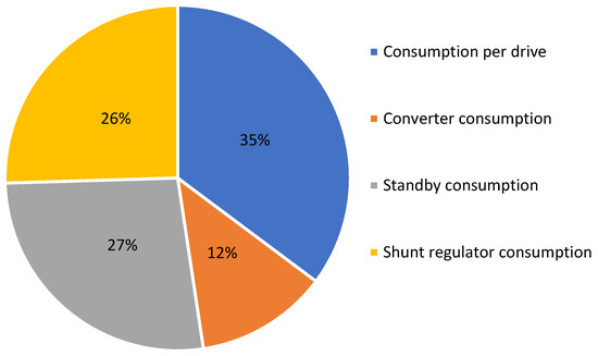 This analysis shows the system’s consumption agents (Figure 11). The highest consumption is due to the four drives of the electronic lock (35%), followed by standby consumption (27%), almost the same value as the shunt regulator (26%) and supplemented by the 12% of the boost converter (12%).
