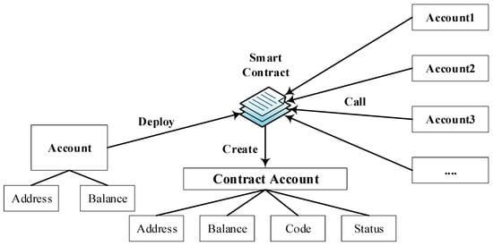 As shown in the Figure 1, the user first creates a personal account for their Ethereum wallet, which is generated based on public key encryption and includes the user’s address and balance. Then the user deploys the compiled smart contract code to the blockchain, and the contract account is generated after the contract is successfully deployed, which includes the contract address, balance, status, and code. Other personal accounts can invoke the smart contract on the chain through the contract address, save/take Ether to the contract, or change the contract status according to the code.