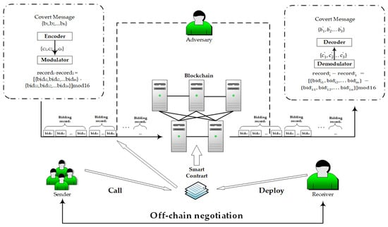 This section introduces the stealthy communication model with blockchain smart contract for bidding systems proposed in this paper. Figure 2 shows the system model of the proposed scheme.