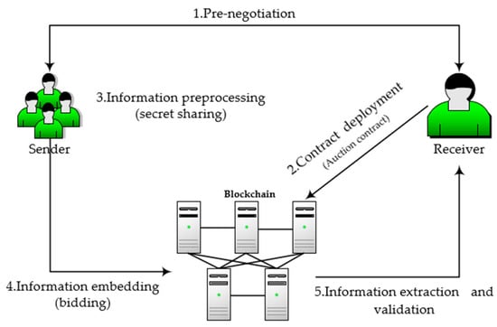 In our proposed scheme, a complete covert communication process includes five steps, as shown in Figure 3. The sender and the receiver need to pre-negotiate, and then the sender needs to deploy the smart contract to the chain to facilitate the transmission of hidden information. The sender preprocesses the information and then embeds it into the blockchain transaction that invokes the smart contract. The receiver extracts the hidden information through the transaction log and verifies it. The detailed process will be shown in Section 4.2, Section 4.3, Section 4.4, Section 4.5 and Section 4.6 of this chapter.