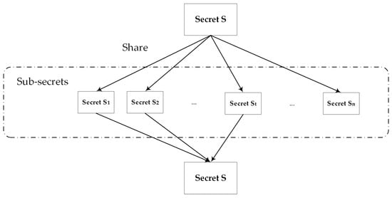 The sharing and reconstruction process of secret-sharing: 1. The secret S is divided into n sub-secrets, with each piece being held by a different participant. 2. Upon acquiring t of these sub-secrets, the original secret S can be reconstructed.
