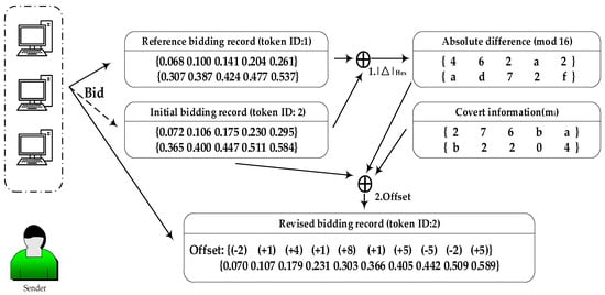 Information embedding: 1. After taking the difference between the initial bidding record and the reference bidding record, then taking that result modulo 16 to obtain . 2. The result of subtracting from the secret message mi is then plugged into Formula (6) to derive the offset. This offset is subsequently applied to the initial bidding record, yielding the revised bidding record.