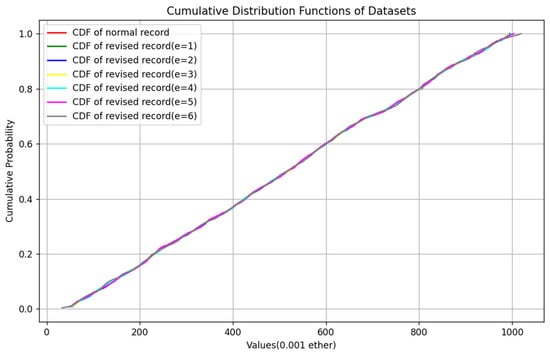 where X is a random variable and x represents all real numbers. By comparing the similarity of the cumulative distribution function of the amount of the normal bidding record and revised bidding record, we can intuitively see whether they are indistinguishable. Figure 6 shows their CDF function curves.