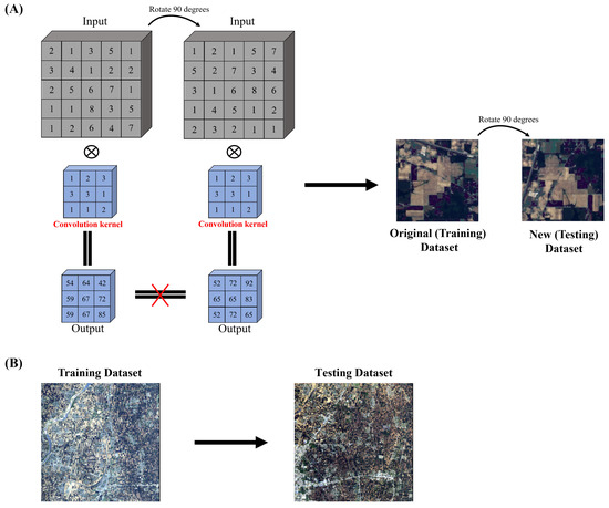 The first approach is to train the model on the original image and then test it on the rotated dataset to simulate cross-scene evaluation. This is because the output of the same convolutional kernel is not the same when confronted with the same feature at different rotation angles. Previous studies [26] have demonstrated that data augmentation with rotations can only serve to mitigate, rather than address, the sensitivity of the Convolutional Neural Network-based model to spatial rotation. Therefore, even if the training samples are subjected to data augmentation such as rotation, the spatial distribution of the samples before and after rotation remains different for the model. This approach ensures that HSI is free of band number differences, weather differences, and class differences and allows the network to focus only on different features of the spatial distribution of land cover as shown in Figure 2A. It is worth noting that this approach is not a complete substitute for true cross-scene evaluation.