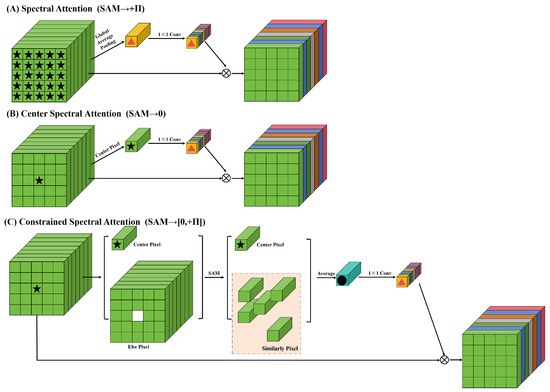 To be able to generate appropriate spectral attention weights, this paper proposes a novel spectral attention mechanism named constrained spectral attention as shown in Figure 4C. The constrained spectral attention utilizes spectral angle mapping (SAM) [61] to measure the similarity of the center pixel to other surrounding pixels. The SAM is calculated as follows: