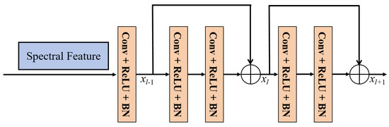The spectral information undergoes spectral attention to form preliminary spectral features, and the deeper spectral features are learned using a spectral feature extraction network constructed from the residual module. The spatial size of the convolution kernel in the spectral feature learning module is set to 1 × 1 to avoid the interference of spatial information. Figure 5 shows the residual structure of the spectral feature extraction module, which consists of two residual blocks. The use of residual blocks avoids the problem of information loss as the network depth deepens [62,63]. Equations (2) and (3) represent the computation process of the residual module: