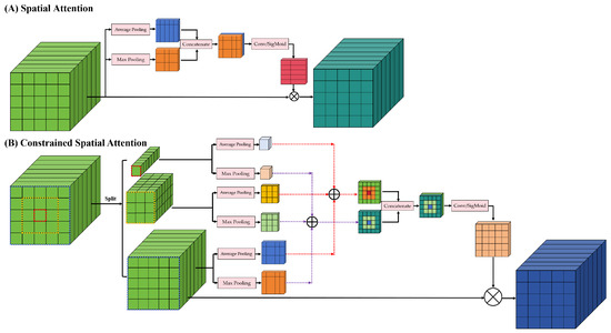 Structural diagram of different spatial attention. (A) Spatial attention. (B) Constrained spatial attention. The constrained spatial attention is proposed in this paper.