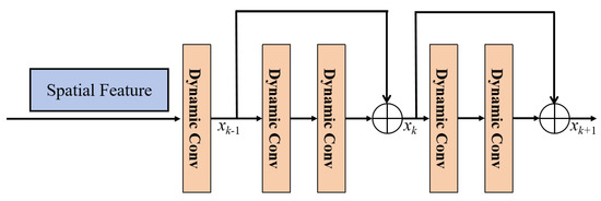 Figure 7 shows that the spatial feature extraction module consists of multiple dynamic convolutional layers [64,65,66]. These dynamic convolutional layers are comprised of two residual blocks. Equations (4) and (5) represent the computation process of the dynamic convolutional residual block: