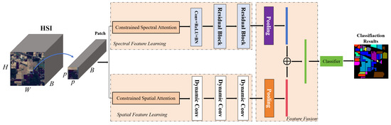 Considering that the HSI is a three-dimensional cube [53], it is assumed that denotes the HSIs, where represents the spatial size of the image. is the number of bands. The is the land-cover classes. represents the number of categories.