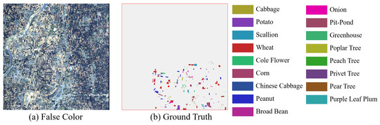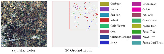 - Indian Pines: The Indian Pines (IP) dataset has a spatial size of 145 × 145 and contains 200 spectral bands that can be used for experiments. The wavelength range of this dataset is 400–2500 nm. A total of 10,249 samples from 16 different classes are included. The number of training and testing samples on the IP dataset is listed in Table 1. Figure 9a,b show the false-color composite image and ground truth of the IP dataset, respectively.