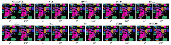 Figure 13, Figure 14, Figure 15 and Figure 16 show the classification visualization results of different methods on different datasets. Table 7, Table 8, Table 9, Table 10, Table 11, Table 12 and Table 13 show in detail the classification accuracy, average accuracy (AA), overall accuracy (OA), and Kappa coefficient () of these algorithms for each category on different datasets. Specifically, CSSARN maintains good generalization even with the rotated dataset, while the classification accuracy of all other spectral–spatial methods decreases significantly. Based on this analysis, the number of parameters and time efficiency of the model are explored in this section.