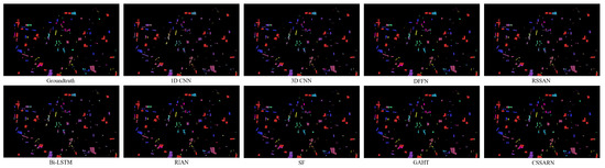 Table 12. Category accuracy, OA(%), AA(%), and for each method on the GF14-C17 dataset.Although the CSSARN attains the best classification accuracy for only seven categories, the OA, the AA, and the Kappa values are the highest. This indicates that the CSSARN performs less well than a particular method in some categories but has a better overall performance. The OA is improved by at least 1.02% on GF14-C17.Figure 15 illustrates the visualization of each algorithm on GF14-C17. Considering that the original image is large, only the image containing the test sample region is shown here, and the whole image is not. From the visualization results, the difference between the CSSARN and the ground truth is not apparent, while the other algorithms have noticeable differences with the ground truth. It indicates that the CSSARN could effectively learn spectral–spatial features and achieve high classification accuracy.