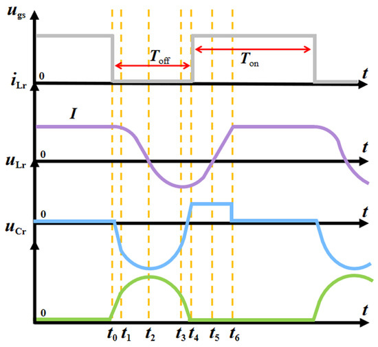 The schematic in Figure 1 can provide the adjustment of the resonant frequency by ensuring zero-voltage-switching conditions, i.e., the voltage or must be zero whenever the switch is closed, as per the waveforms in Figure 2. In one steady-state switching period, the converter experiences six switching modes, the equivalent circuits of which are depicted in Figure 3.