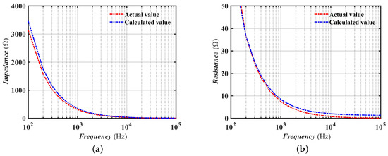 Comparison between test data and the prediction results of the fractional-order impedance model: (a) frequency–impedance curve and (b) frequency–resistance curve.