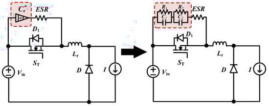 Figure 1 shows a typical ZVS QRC, in which a resonant capacitor is in parallel with the power switch and the power diode . Therefore, the charging or discharging state of the resonant capacitor changes with the on or off state of the switch , thus affecting the resonant state of the resonant unit and the switching mode of the converter. Note that the resonant capacitor is modeled by a simplified fractional-order impedance model, which comprises an ideal fractional-order capacitor and a series resistance [27]. Then, the switching mode and working states of the converter can be deduced according to the KVL law and the KCL law.