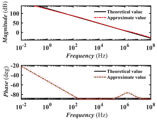 The above results indicate that the CBB film capacitor has fractional-order characteristics. However, there are no such components in existing simulation software. Therefore, we used Oustaloup’s approximation method to build such a fractional-order capacitor in the simulation for comparison, the structure of which is shown in Figure 8. An ideal fractional-order capacitor can be obtained by connecting the resistor and the capacitor in parallel as a unit in series, which is verified by the amplitude frequency characteristic and the phase frequency characteristic in Figure 9. Obviously, the frequency range for this approximation is from Hz to Hz and the pre-determined error y is less than 3 dB. The resistors and in Table 1 are the components involved in the capacitor and resistor parallel units in the method.