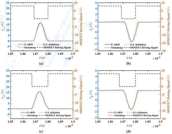 The results of the numerical solution for the ZVS QRC based on the F-ABM method, Oustaloup’s method, and the GL definition method are obtained as shown in Figure 10. It can be observed that the waveforms obtained by the three approaches coincide with each other. Therefore, the results of the numerical calculation and simulation by these three methods can be used as a reference for the theoretical analysis.