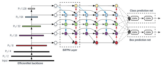 Under the EfficientDet backbone network, we propose a weighted bi-directional feature pyramid network (BiFPN). This network enables simple and rapid multi-scale feature fusion. As depicted in Figure 5, a notable feature of this network is its ability to integrate more feature information without increasing the computational overhead.