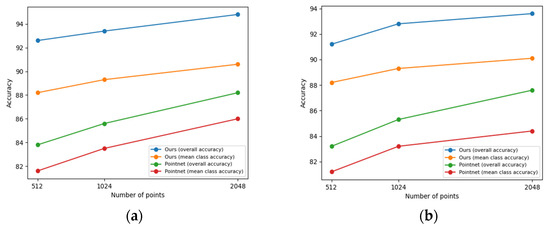 Classification accuracies corresponding to different sampling point numbers. (a) Parkpoint; (b) Roadpoint.