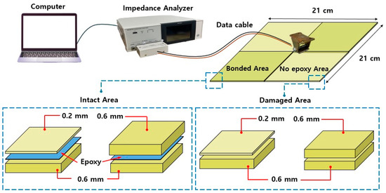 To investigate the damage detection performance of the proposed PZT device, two glass fiber-reinforced polymer (GFRP) 210 mm square plates were made. The difference in the composite structures was the thickness of the top plates, where 0.2 mm and 0.6 mm thick GFRP were attached to the bottom plate of 0.6 mm using epoxy. Then, the areas were divided into intact and damaged areas, where damage was given by delaminating the two plates, as shown in Figure 1. In general, the EMI technique can be performed using various equipment. These include an AD5933 evaluation board, a function generator connected to an oscilloscope, and various impedance analyzers. Using the impedance analyzer IM3570 for this study, the proposed PZT device was connected, and the test involved simply putting the PZT device onto the surface of the composite structure’s surface to acquire impedance signatures. The main part of the analyze was to evaluate the damage detection performance of the PZT device by measuring the impedance signatures of the intact and damaged areas without permanently attaching the PZT device to the surface of the composite structure.