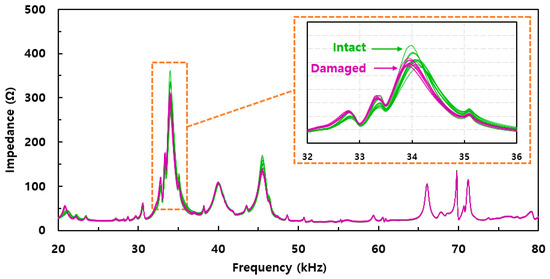 Additional peaks can be found near 40 kHz and from 66 kHz to 72 kHz, where the impedance values are smaller compared to the other peaks. From these peaks, the variations in the impedance signatures are very small, regardless of the intact and damaged areas. Thus, from this experiment, we can see that the two largest peaks located near 33 kHz and 45 kHz would be useful when detecting delamination damage to the composite structure shown in this study.