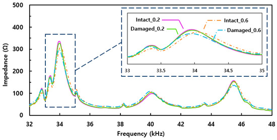 From the figure, the difference between Intact_0.2 and Damaged_0.2 is barely noticeable, where the RMSD value calculated here is 2.69%. Although the intact case signatures showed large variations with high impedance values in the previous section, the very small difference in the averaged signatures and the low RMSD value show that the proposed idea is not effective when detecting delamination of the composite structure with a 0.2 mm top plate thickness. On the other hand, the averaged signatures of Intact_0.6 and Damaged_0.6 shows a clear difference between the two cases, where Damaged_0.6 shows smaller impedance values for the peaks located near 34 kHz and 46 kHz. Here, the calculated RMSD value was 11.00%, which is about four times higher compared to the RMSD values calculated from Intact_0.2 and Damaged_0.2. Thus, this experimentally proves that thinner structures do not always result in better outcomes, as shown by this experiment.