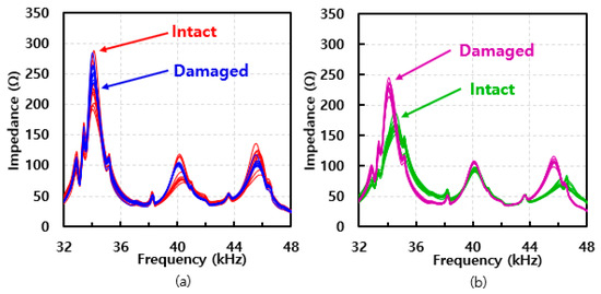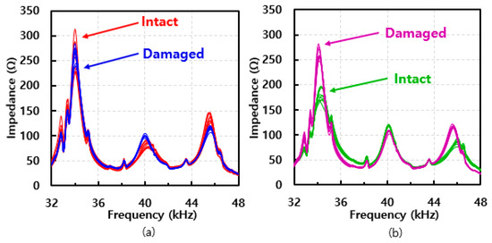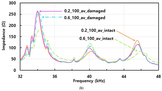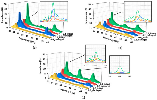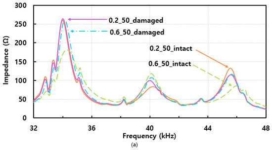 All the impedance signatures acquired from the two different composite structures with thicknesses of 0.2 mm and 0.6 mm on top plate are shown in Figure 6a and Figure 6b, respectively. Comparing both figures, an interesting observation is made here regarding the height of the impedance signature peaks. With Figure 6a, the impedance peaks are generally higher for the damaged case near 40 kHz compared to the intact case, but this trend becomes opposite at the 46 kHz frequency, with the damaged case signatures having lower values in general. For Figure 6b, the impedance peaks are higher for the intact case near 40 kHz and become lower at around 46 kHz compared to the damaged case. This trend is different compared to Figure 6a, which experimentally shows that the different thicknesses of composites can result in a totally different outcome.