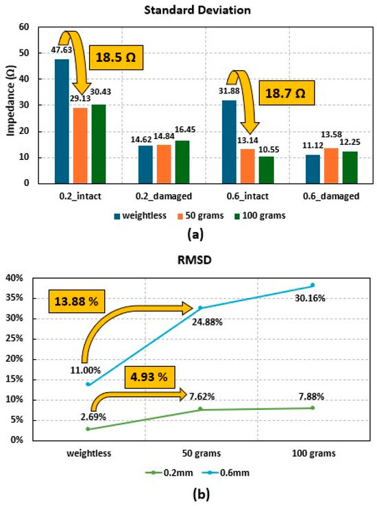 In addition, reliability was analyzed through the standard deviation of repeated impedance values. From Figure 9, it was confirmed that the standard deviation of the device without weight is greater than the standard deviation of the device with 50 g and 100 g added. In Figure 10b, it was confirmed that the biggest difference in standard deviation was when no weight was applied to the intact area and when 50 g was applied, along with the low standard deviation in the damaged area. The difference in these values is 18.5 Ω at 0.2 mm and 18.7 Ω at 0.6 mm, and from these values, it can be concluded that adding weight regardless of the difference in thickness in the intact area has a positive effect on the reliability of damage detection.