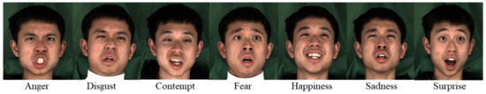We utilized the multi-view emotional audio-visual dataset (MEAD) [23] to generate synthetic facial animations. The choice of the MEAD dataset stemmed from its extensive collection of sentences representing various emotion types and intensities, rendering it a valuable resource among publicly available audio-visual datasets. This dataset encompasses talking-face videos captured from 60 actors and actresses, each expressing eight emotions (i.e., anger, disgust, contempt, fear, happiness, sadness, surprise, and neutral) at three intensity levels (i.e., weak, medium, and strong). Examples from the MEAD dataset are illustrated in Figure 1.