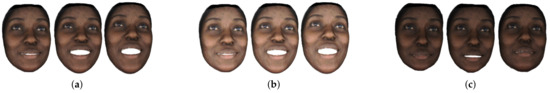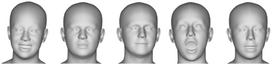 We utilized the detailed expression capture and animation (DECA) model proposed in [44] to extract 3D facial animation data from the MEAD dataset. Figure 2 showcases examples of the 3D facial animation data obtained from the MEAD dataset using the DECA model. For each video entry in the MEAD dataset, we employed DECA to execute the FLAME (faces learned with an articulated model and expressions) fitting algorithm [45,46,47,48,49]. Specifically, we relied on the fitting outcomes produced by the FLAME template model exclusively to mitigate potential disparities in the fine-grained details of the 3D facial models, which could potentially affect participants’ assessments.