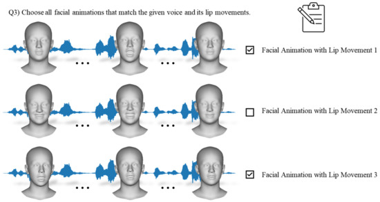 - Experiment III: Lip movement—Choose all facial animations that match the given voice and its lip movements.