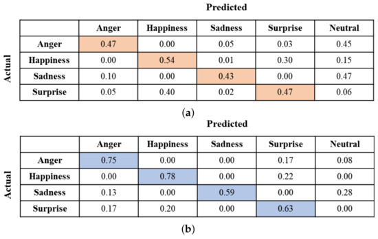 In Figure 9, the confusion matrices depict the emotions perceived by the participants based on the given voice. The diagonal elements in each confusion matrix indicate the correctly predicted rates for emotions. As shown in Figure 9a, when the emotion intensity is low, the accuracy of estimating emotions is significantly low. From the figure, we observed that misprediction, where the actual emotion is predicted as another emotion, occurred frequently for all four emotions. The participants often confused Happiness with Surprise and vice versa. Additionally, Anger and Sadness are mostly mispredicted as Neutral. Conversely, when the emotion intensity is high, the participant’s ability to accurately identify emotions improved, as demonstrated in Figure 9b. From this figure, we also observed that the rate of mispredicting Anger as Surprise somewhat increases and vice versa. These observations indicate that participants often confuse Anger with Surprise and vice versa when emotion intensity is high. For all emotions, the rate of mispredicting an emotion as Neutral decreases significantly. However, some participants still confuse Sadness with Neutral. This suggests that solely relying on the voice is insufficient for precise emotion recognition.