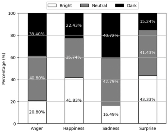Certainly, the specific values are detailed in Figure 13. In Figure 13a, the selection ratios of bright, neutral, and dark appearances for high valence are presented. Remarkably, the ratio of bright selections is 2.2 times higher than that of the dark selections. Conversely, for low valence, the ratio of dark selections is more than twice that of the bright selections. These results emphasize the potential impact of the 3D virtual character’s appearance on their emotional expression. Additionally, these findings reveal a compelling connection between the appropriate level of brightness in appearance and the emotional valence being expressed. Specifically, participants consistently preferred a brighter appearance for emotions characterized by high valence, while they gravitated towards a darker appearance for emotions associated with low valence.