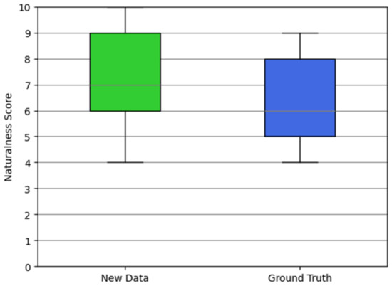 According to the findings presented in Figure 14, the average score for the new data (i.e., facial animations with the highest score) surpasses that of the ground truth animations. Specifically, for the new data, we observed an average score of 7.641 with a standard deviation of 2.846, while for the ground truth, the average score was 6.648 with a standard deviation of 3.059. In the figure, the minimum is the smallest number among the data points. For the new data and the ground truth animations, the minimum recorded naturalness score was 4. On the other hand, the maximum is the largest number among the data points. For the new data, the maximum recorded naturalness score was 10, whereas for the ground truth animations, it was 9. These results suggest that certain synthesized facial animations exhibit a higher level of emotional expressiveness compared to the facial animations performed by the human speaker. Therefore, our results underscore the importance of considering each of the defined factors when generating 3D virtual characters in virtual environments for effective emotional representation.