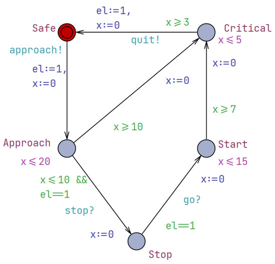 - Yovine, S. Model checking timed automata. In School Organized by the European Educational Forum; Springer: Berlin/Heidelberg, Germany, 1996; pp. 114–152. [Google Scholar]